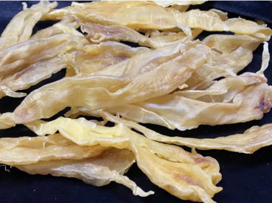 苏里南鱼胶也被称为“北海鱼胶”,但与广西北海并没有关系。这类鱼胶大都产自南美洲苏里南、巴西、秘鲁、委内瑞拉等地。其外观有2只“耳朵”,胶体相对干净,少油腻,胶质好,口感细腻。